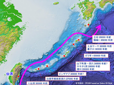 3萬8000年前的「對馬路線」(從朝鮮半島經由對馬島,自九州登陸)